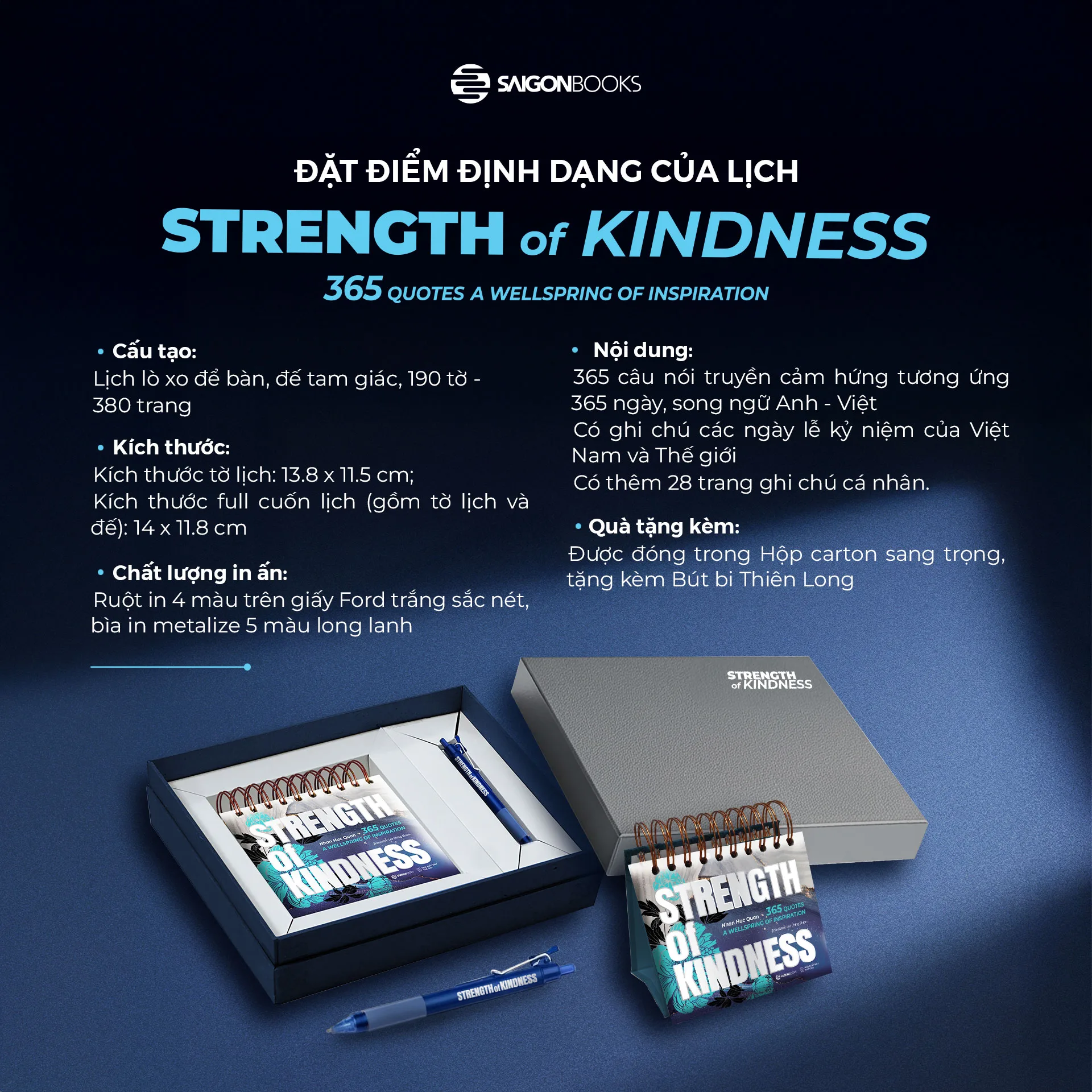 "STRENGTH OF KINDNESS – 365 QUOTES" được thiết kế theo format Lịch để bàn sử dụng trọn đời (chỉ có ngày và tháng, không ghi năm), mang đến một liều thuốc tinh thần cho mỗi ngày trong năm.
