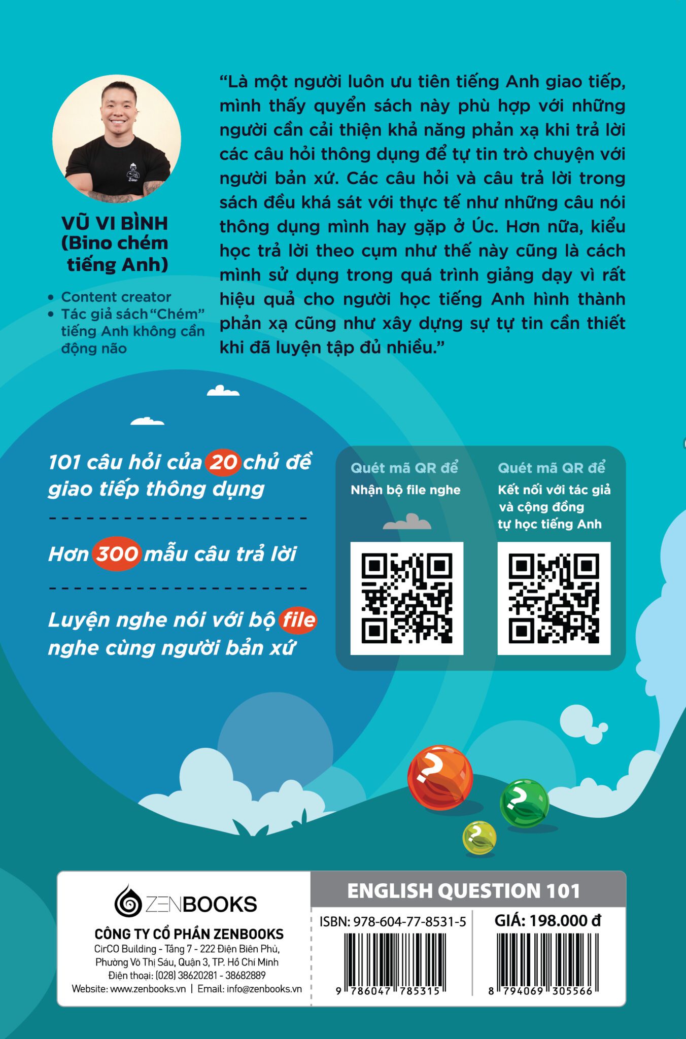 Lộ Trình Học Giao Tiếp Qua Q&A - English Question 101 (Zenbooks phát hành) là cuốn cẩm nang tự học nói tiếng Anh có nội dung khoa học, dễ hiểu và sát với thực tế, phù hợp với mọi đối tượng. Dù bạn mới tiếp cận với tiếng Anh hay đã học ngôn ngữ này từ lâu nhưng mãi vẫn chưa thể giao tiếp trôi chảy thì đều có thể bắt đầu với quyển sách này.