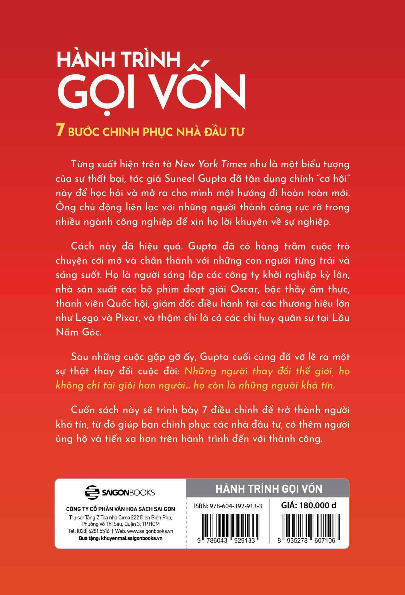 Do đó, tác giả đã viết Hành Trình Gọi Vốn – BACKABLE: The Surprising Truth Behind What Makes People Take a Chance on You. Cuốn sách này sẽ trình bày 7 điều chỉnh, tương ứng với 7 bước để trở thành người khả tín, từ đó giúp bạn chinh phục các nhà đầu tư, có thêm người ủng hộ và tiến xa hơn trên hành trình đến với thành công.