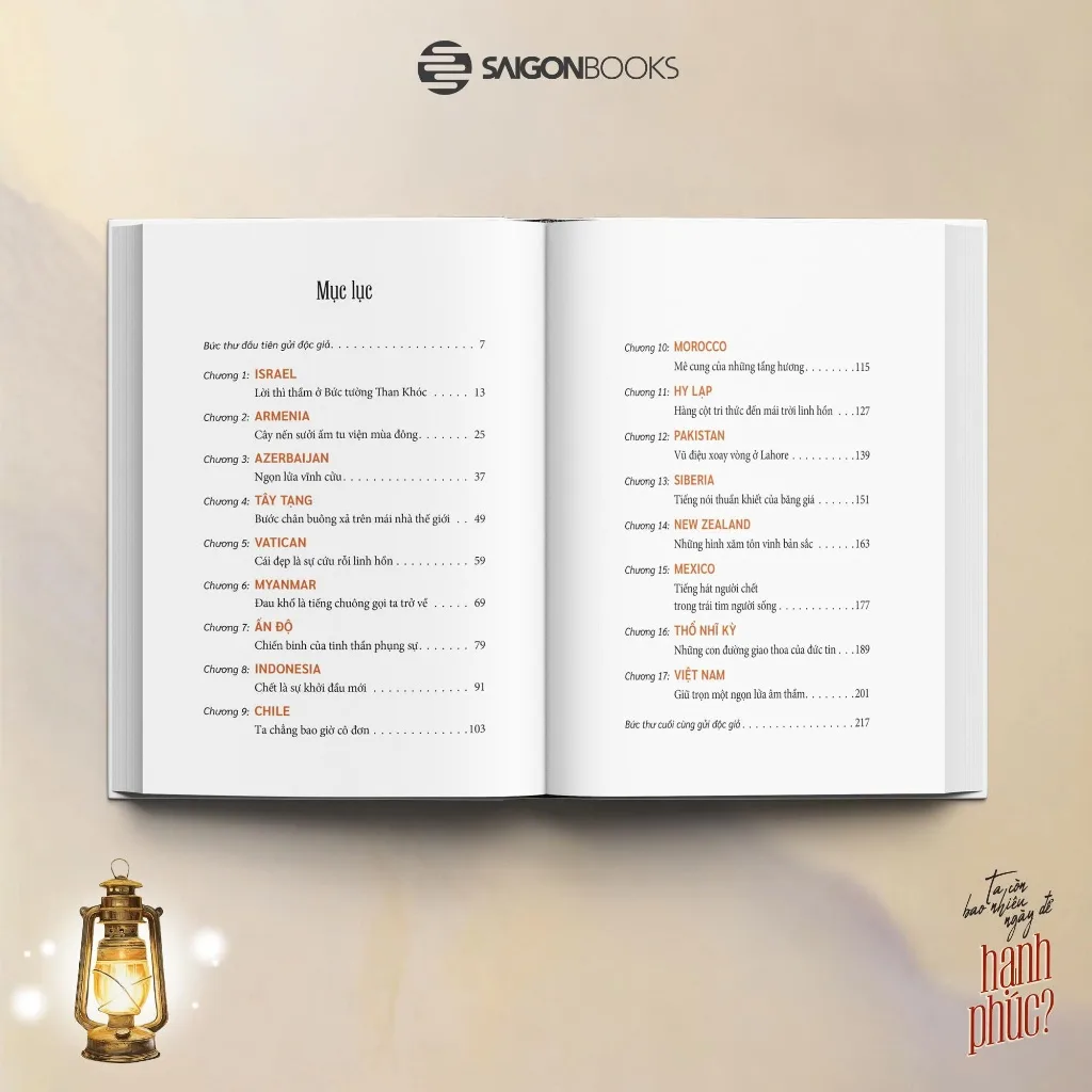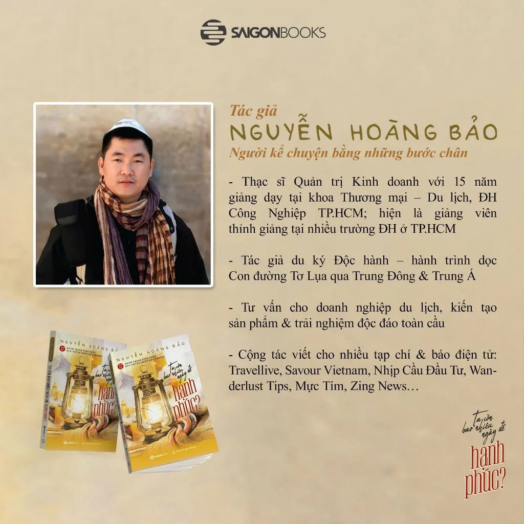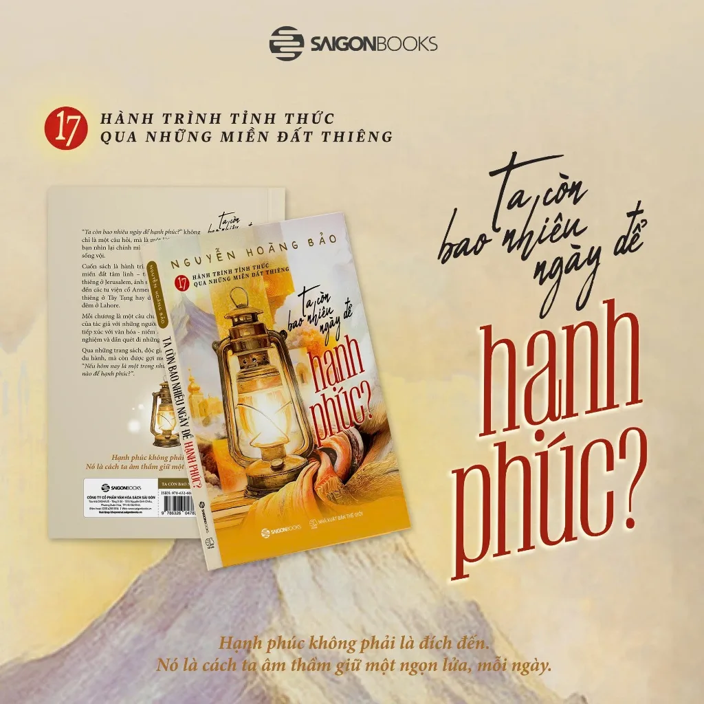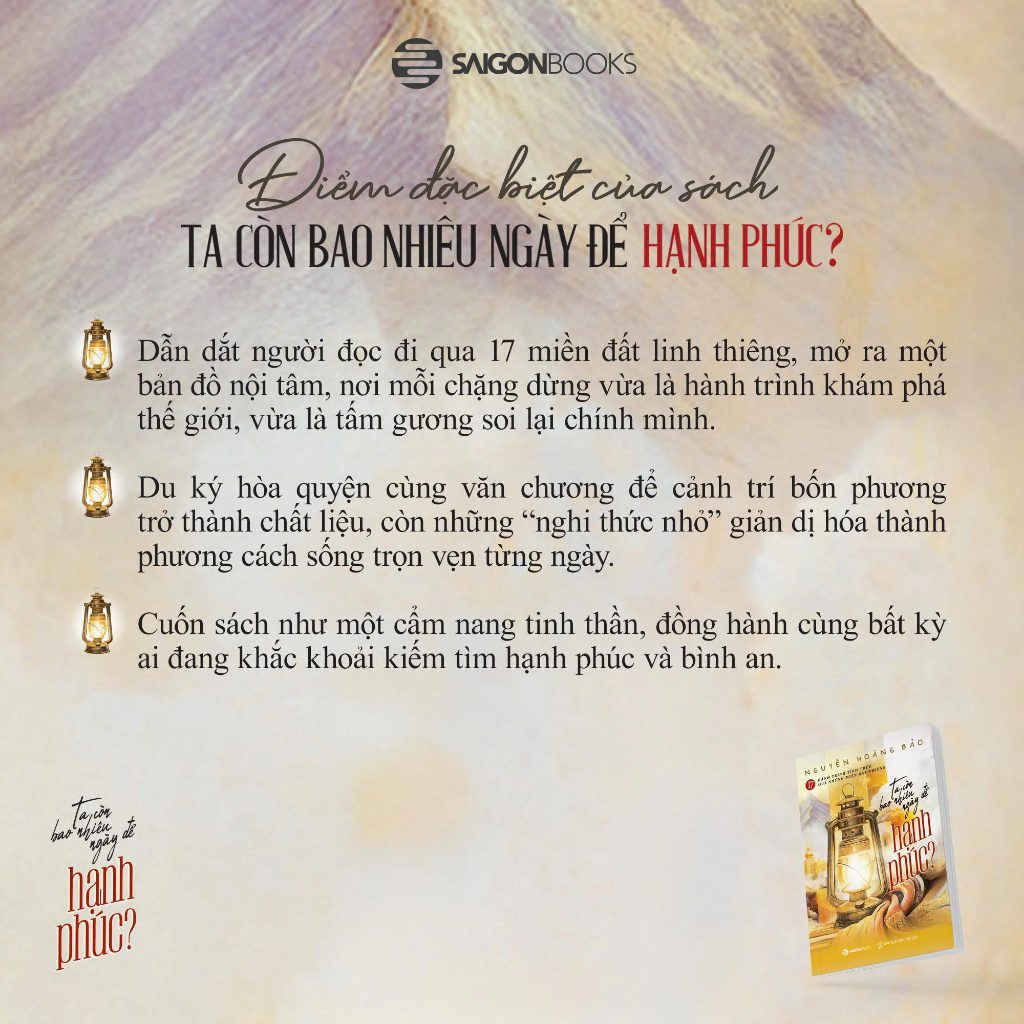 Ta còn bao nhiêu ngày để hạnh phúc? của Nguyễn Hoàng Bảo được viết nên từ chính câu hỏi ấy – một câu hỏi khắc khoải mà cũng thật dịu dàng, buộc ta dừng bước và lắng nghe chính mình. Sau hành trình đi qua hơn 120 quốc gia, tác giả chọn lọc 17 miền đất linh thiêng – từ Bức tường Than Khóc ở Israel, tu viện Sevanavank bên hồ Sevan phủ tuyết của Armenia, những vòng kinh luân xoay đều trong gió Tây Tạng, đến lễ hội người chết rực rỡ ở Mexico, và cuối cùng là Việt Nam – nơi ngọn lửa âm thầm vẫn cháy. Tất cả hợp thành một tấm bản đồ tinh thần cho những tâm hồn du phương đang khao khát tìm lời giải đáp cho hạnh phúc.