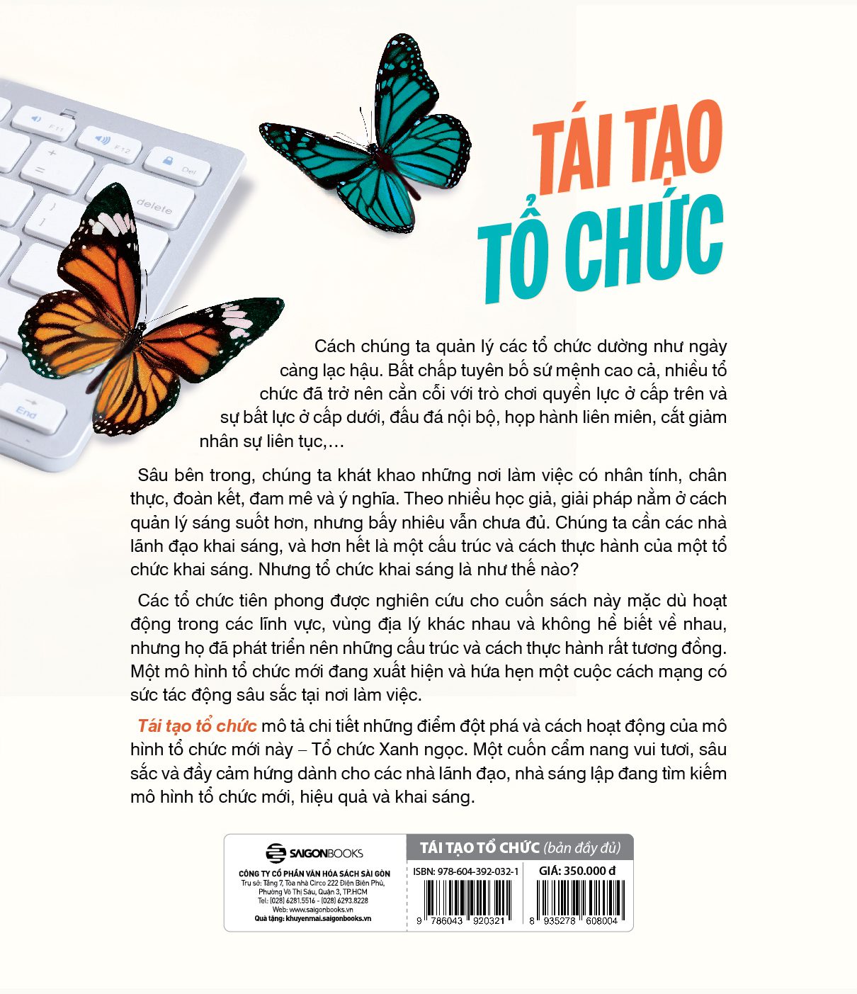 Tái tạo tổ chức: mô hình tổ chức giúp doanh nghiệp phát triển vượt bậc mô tả chi tiết những điểm đột phá và cách hoạt động của mô hình tổ chức mới này - Tổ chức Xanh ngọc. Một cuốn cẩm nang vui tươi, sâu sắc và đầy cảm hứng dành cho các nhà lãnh đạo, nhà sáng lập đang tìm kiếm mô hình tổ chức mới, hiệu quả và khai sáng.