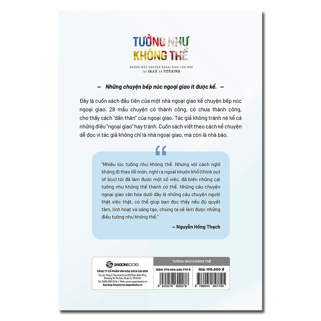 “Tưởng như không thể” được viết bằng giọng văn gần gũi, thân tình, đem đến cho bạn đọc một góc nhìn từ bên trong công việc của một đại sứ quán. Cuốn sách không chỉ dành cho những ai quan tâm đến ngoại giao hay quan tâm đến hai vùng đất trên, mà còn là một món quà cho những trái tim yêu văn hoá và mong muốn lan toả văn hoá Việt Nam đến với quốc tế.