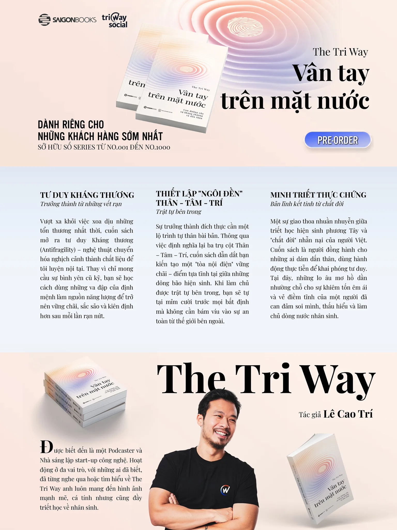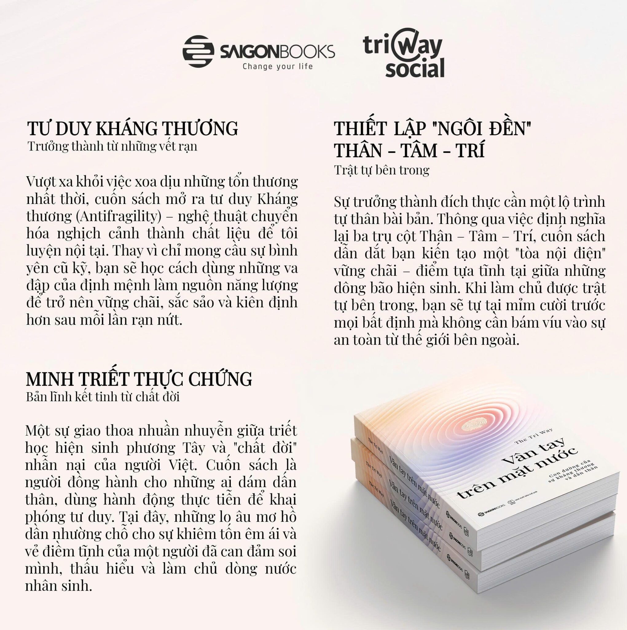 Vân tay trên mặt nước là quyển sách đầu tiên của The Tri Way. Một nỗ lực của những chiêm nghiệm đương đại, cuốn sách này là hành trình chưng cất tư duy xuyên suốt ba chặng đường lột xác của tâm thức, được viết theo đúng tinh thần của The Tri Way: có thể không phải là những thứ bạn thường nghe...