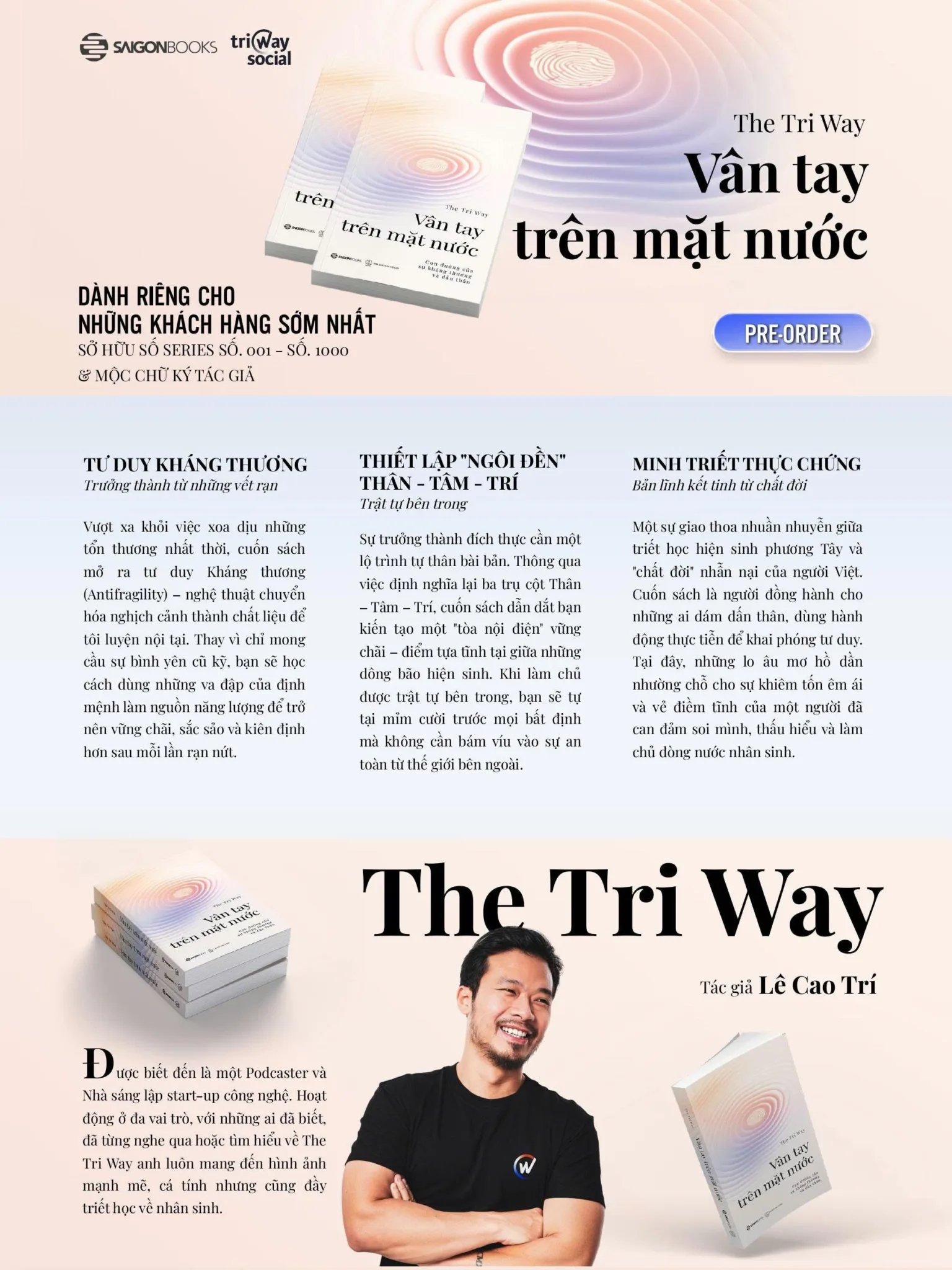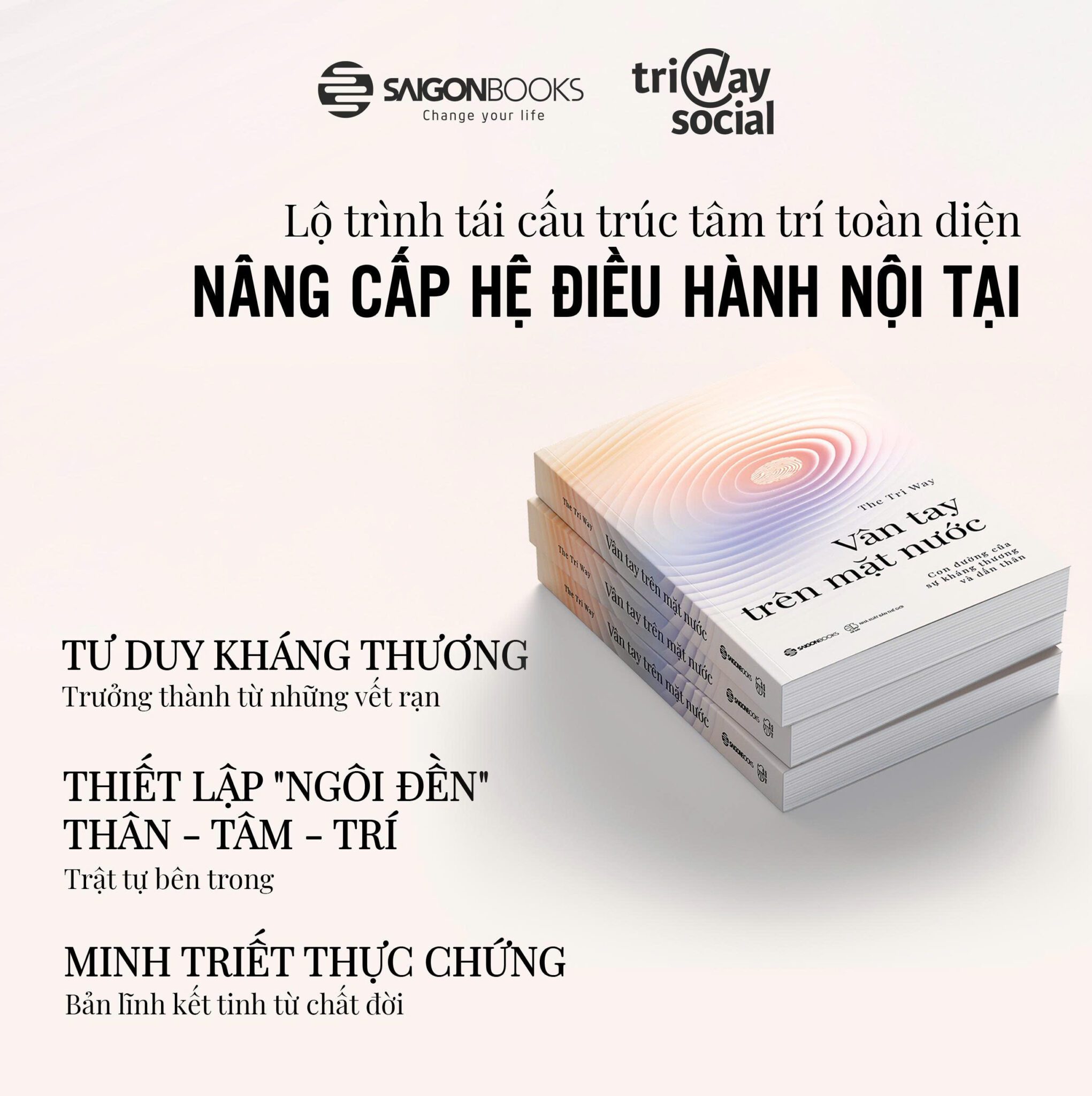 Vân tay trên mặt nước là quyển sách đầu tiên của The Tri Way. Một nỗ lực của những chiêm nghiệm đương đại, cuốn sách này là hành trình chưng cất tư duy xuyên suốt ba chặng đường lột xác của tâm thức, được viết theo đúng tinh thần của The Tri Way: có thể không phải là những thứ bạn thường nghe...