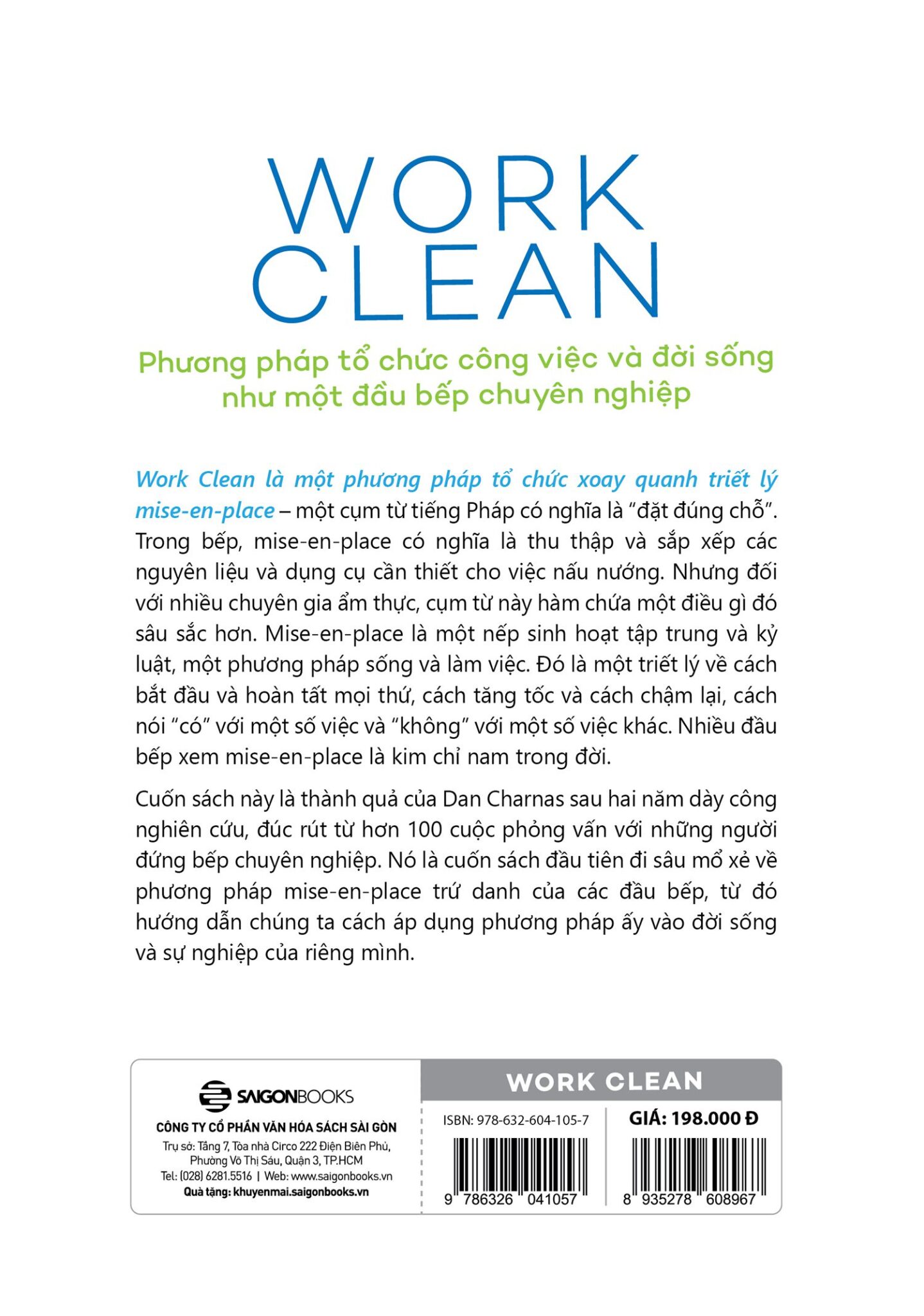 "WORK CLEAN - Phương pháp tổ chức công việc và đời sống như một đầu bếp chuyên nghiệp" không chỉ dành cho những người làm việc trong ngành ẩm thực mà còn cho bất cứ ai muốn cải thiện kỹ năng quản lý thời gian và công việc. Cuốn sách cung cấp những bài học quý giá, giúp bạn nhận ra rằng sự chuẩn bị và tổ chức có thể mang lại sự thành công trong mọi lĩnh vực.